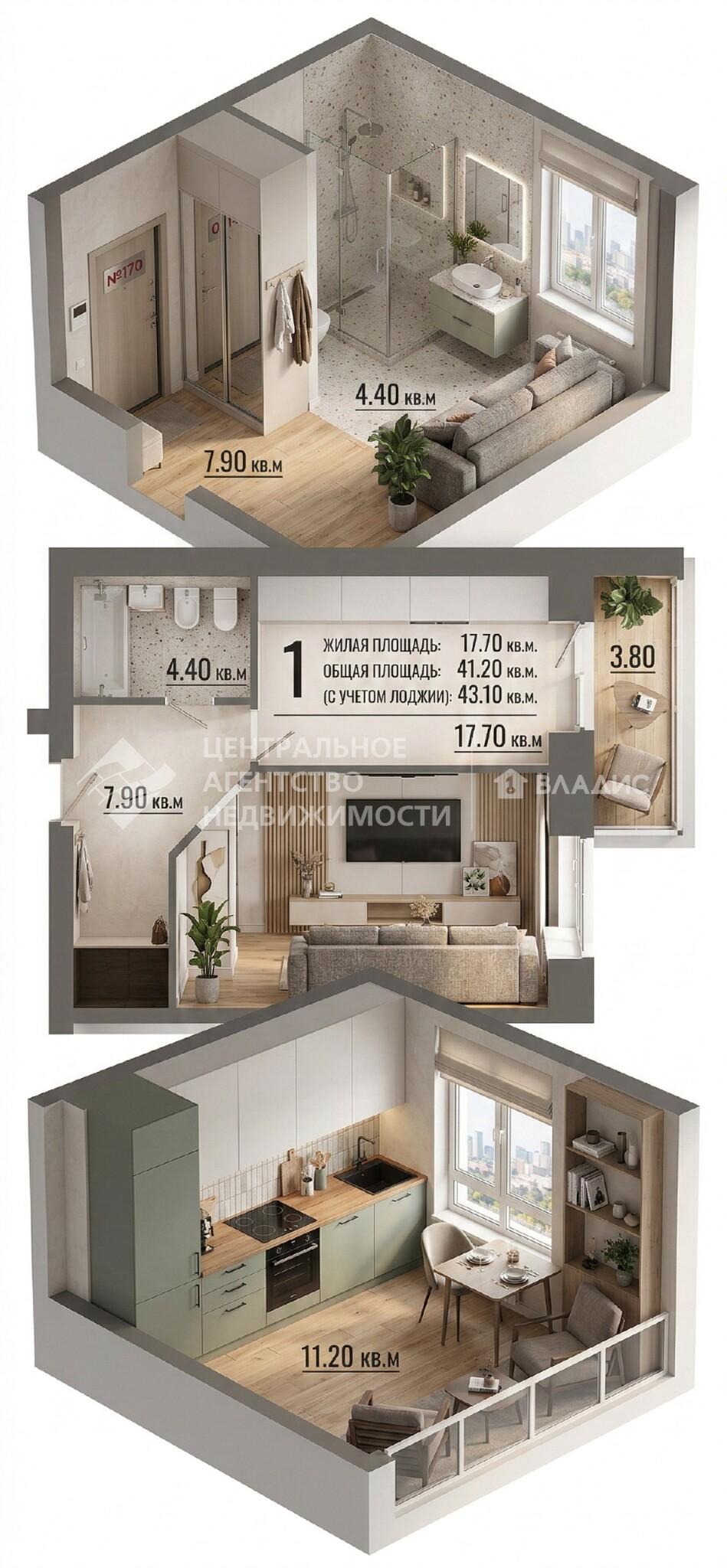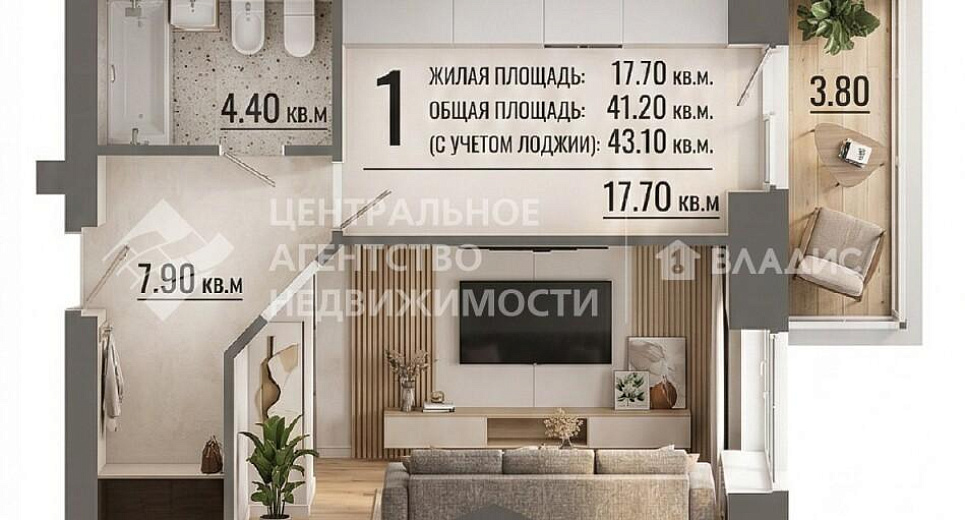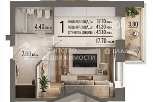 1-комнатная квартира 43.1 м² на 3 этаже