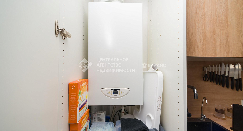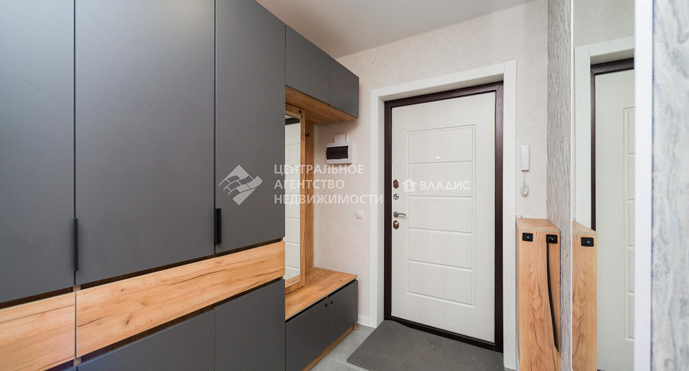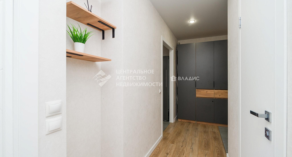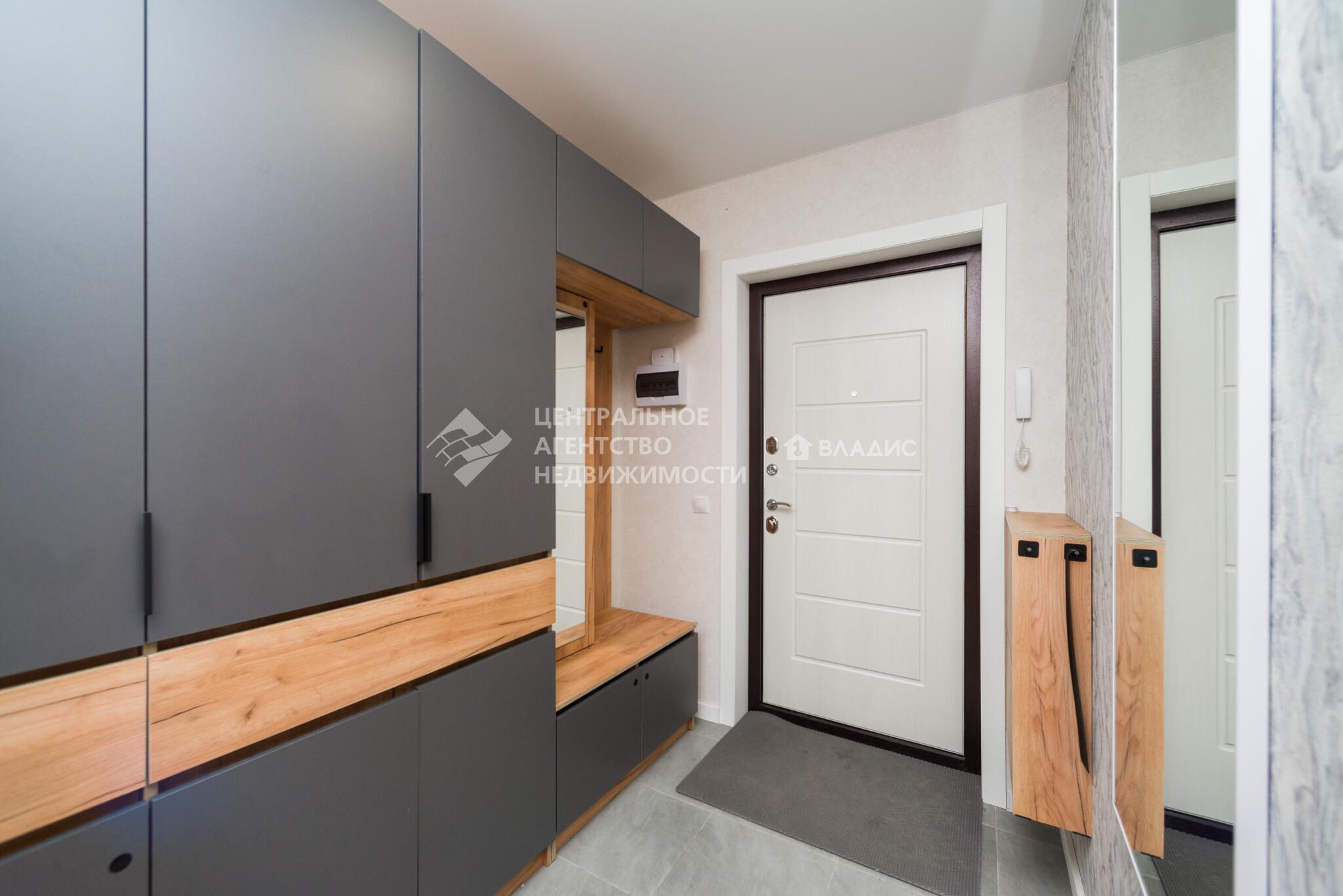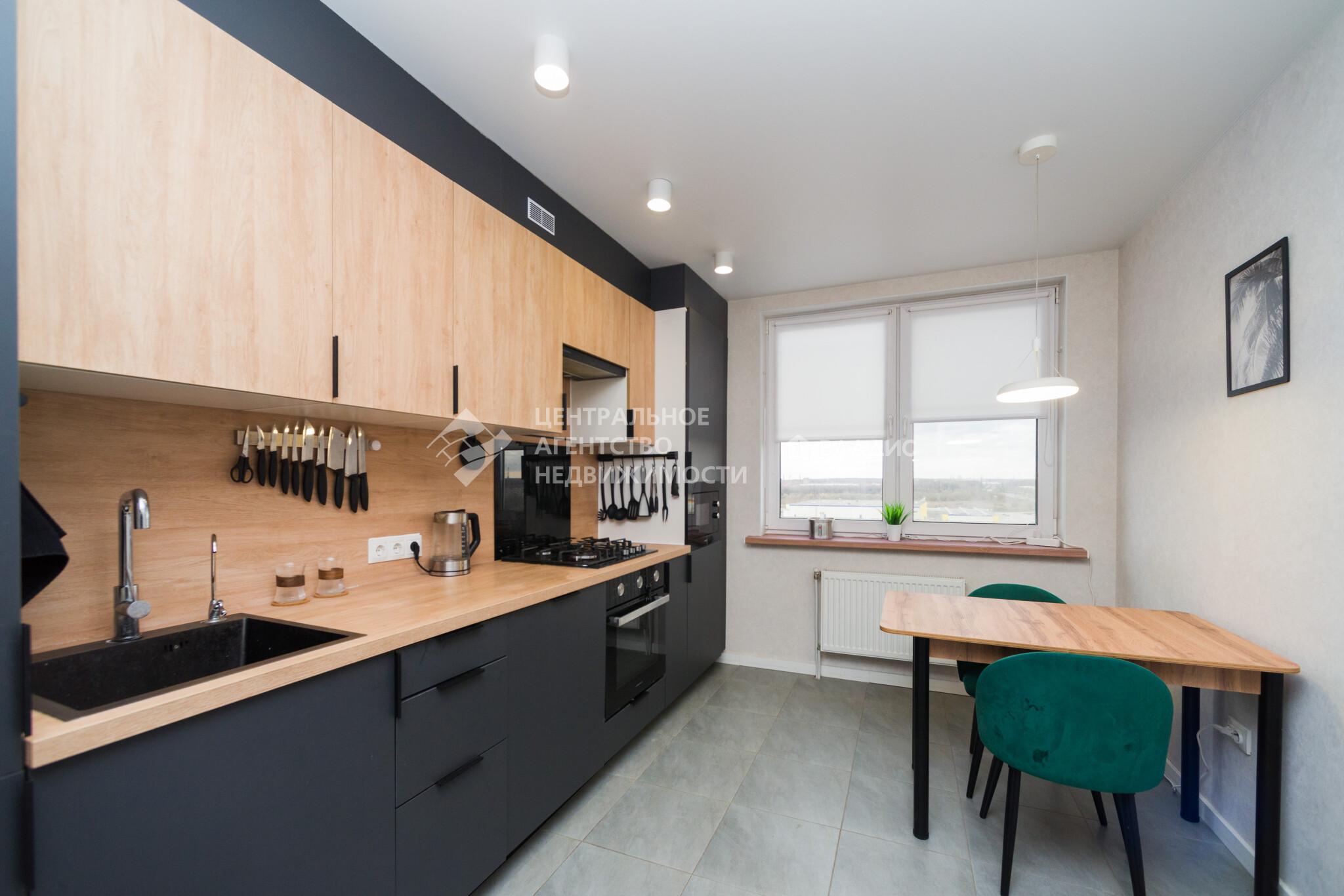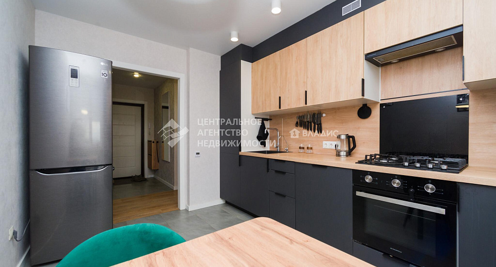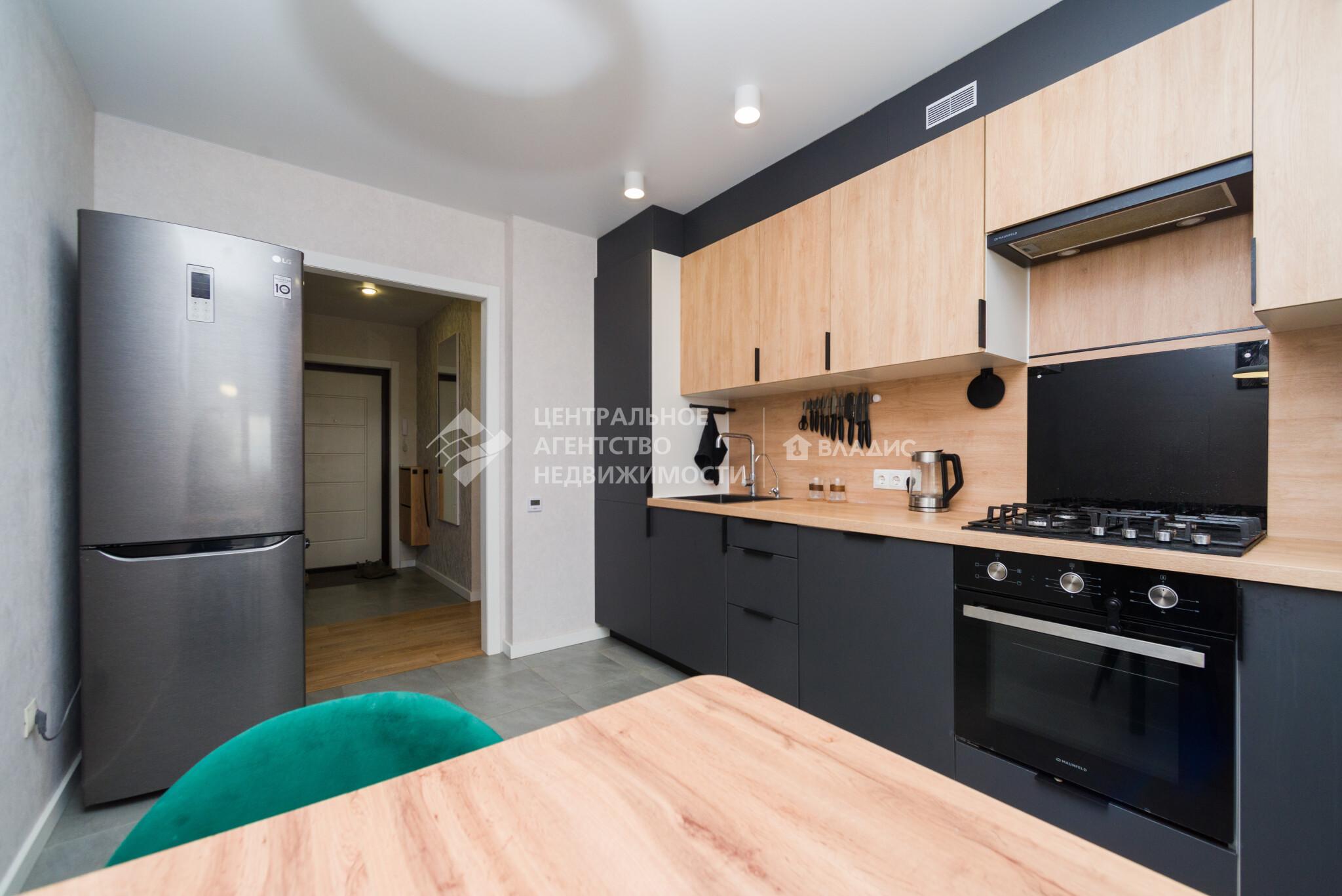 Кухонный гарнитур с посудомоечной машиной, вытяжкой, духовым шкафом, варочной панелью, в коридоре шкаф - система хранения , выполненная на заказ, останется новым владельцам.
