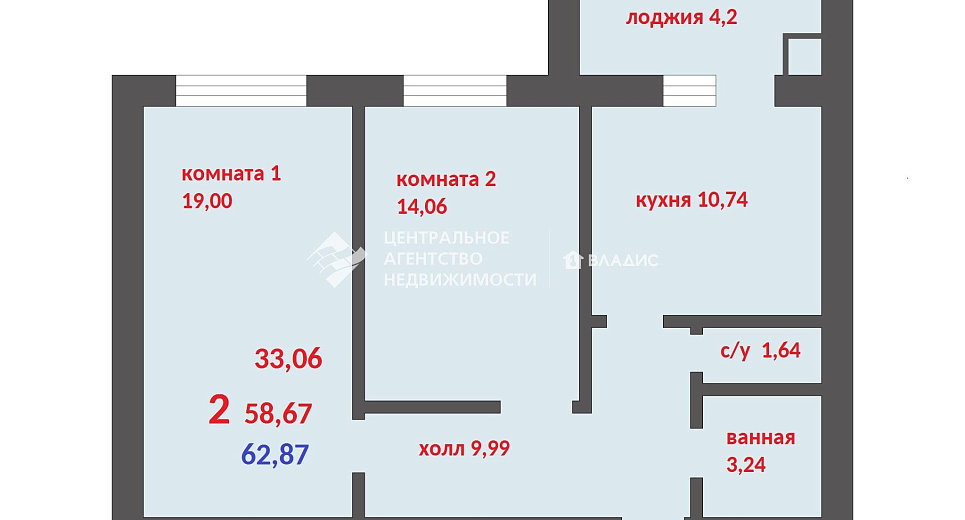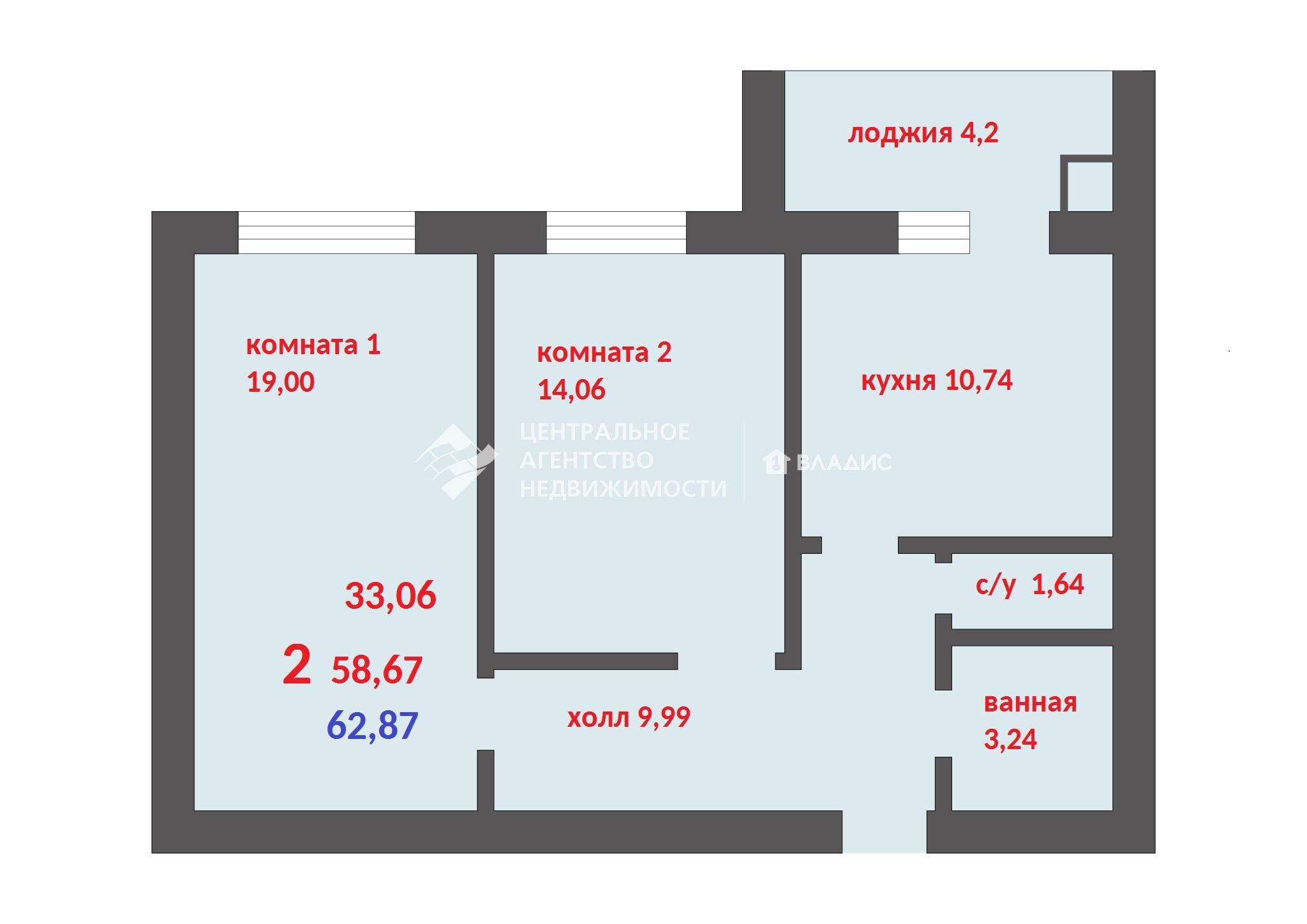 2-комнатная квартира 62 м² на 10 этаже