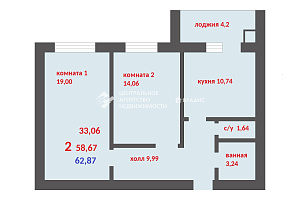 Общая площадь квартиры составляет 62 квадратных метра, из которых 33 квадратных метра — жилая площадь. Две комнаты изолированы, их площадь — 19 и 14 квадратных метра. Кухня площадью 11 квадратных метров идеально подойдёт для семейных ужинов и дружеских встреч. В подарок новый кухонный гарнитур!